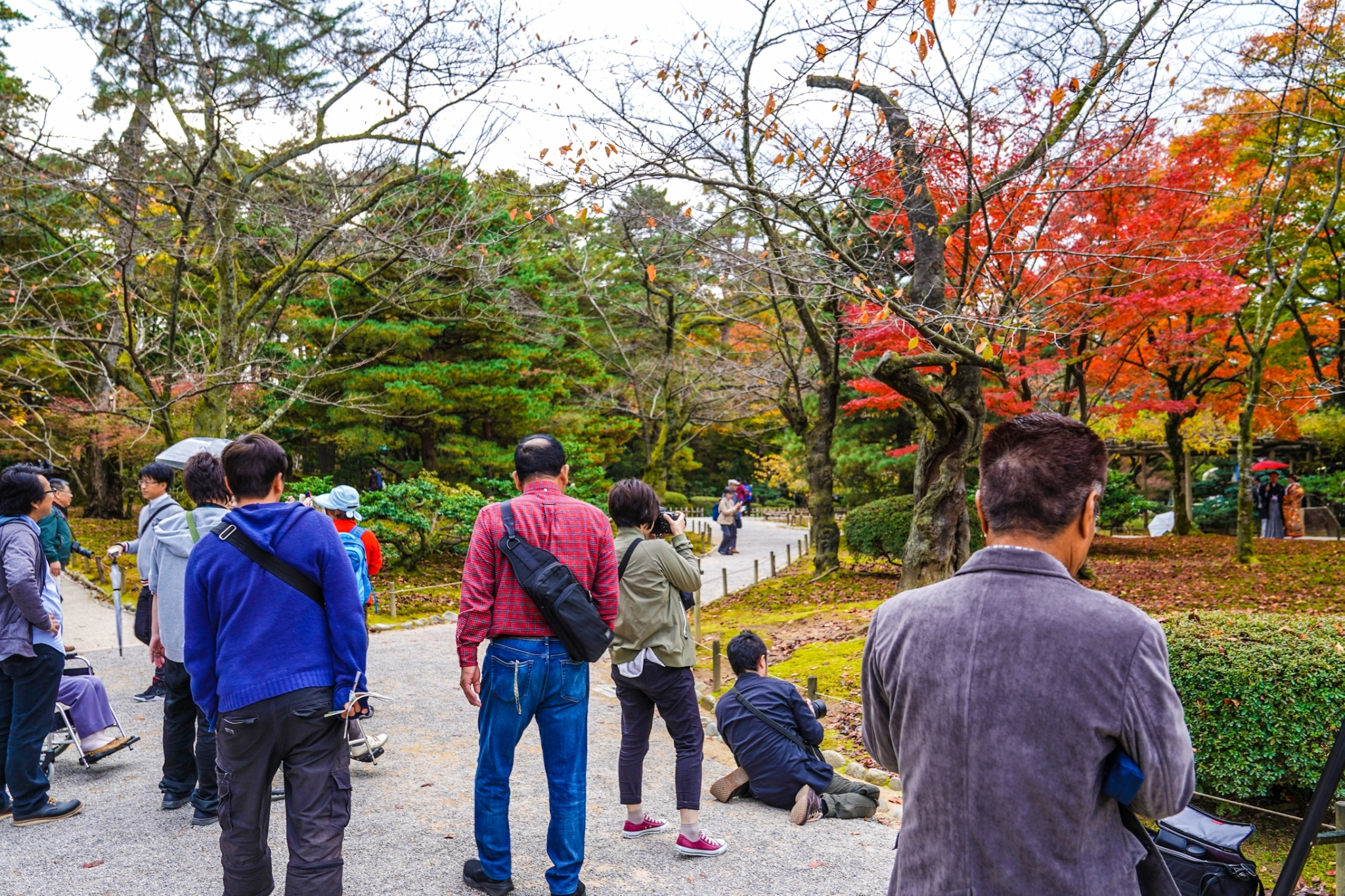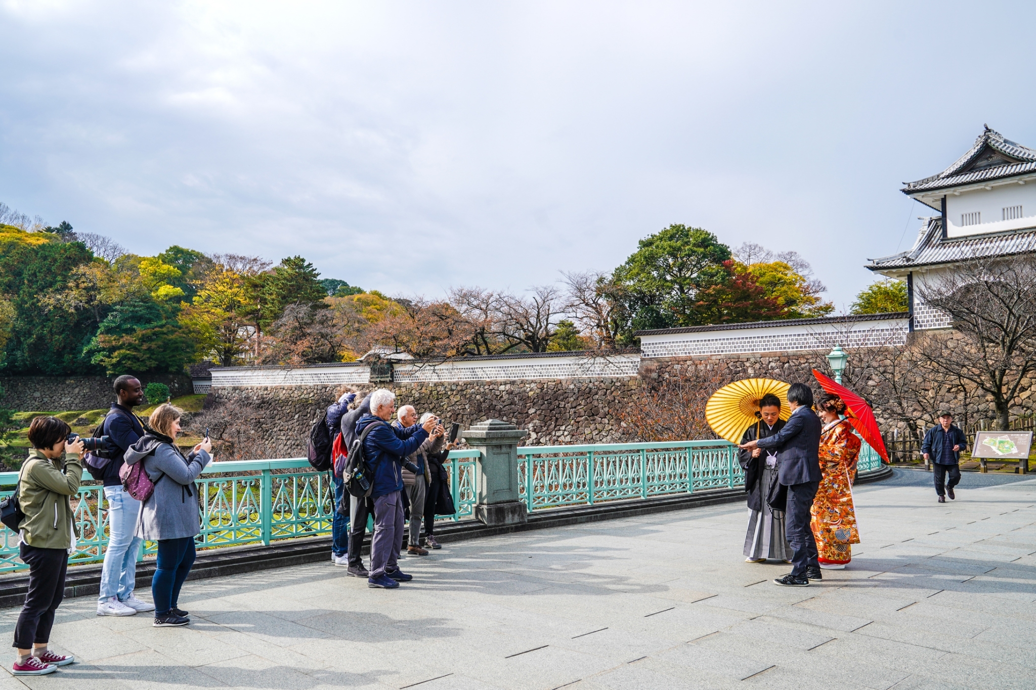 実際に11月にロケーション撮影をした方は、金沢城・兼六園で前撮り撮影された新郎新婦様がいらっしゃいます。雨の多い秋のシーズンで、その前撮り撮影日も雨予報でした。朝から雨の降る中、ロケーション撮影を諦めて、スタジオ内での撮影も考えながら、雨の上がるタイミングを見ていました。一瞬、雨が止んだ隙を狙って、ロケーション撮影を決行!和装の衣装での撮影を望まれた新郎新婦様は、スタッフのサポートも得ながら、動きが自由にいかない色打掛で一生懸命、撮影に挑んでいただきました。和装での前撮り撮影は、落ち着いた兼六園の雰囲気の中で、華やかな情景を創りだします。お二人の撮影の様子はとても美しく、兼六園に訪れた外国人観光客もその美しさに見とれていて、とても興味津々。気づいたときには、お二人は、前撮り撮影隊ではなく、多くの外国人観光客に囲まれながら進める撮影となりました・・・笑。