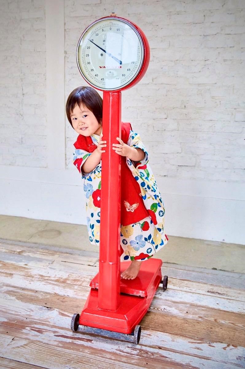 赤いレトロな体重計が新しく登場しました★体重計を取り入れた、子どもの成長の記録が分かりやすい写真を撮ることもできますよ。