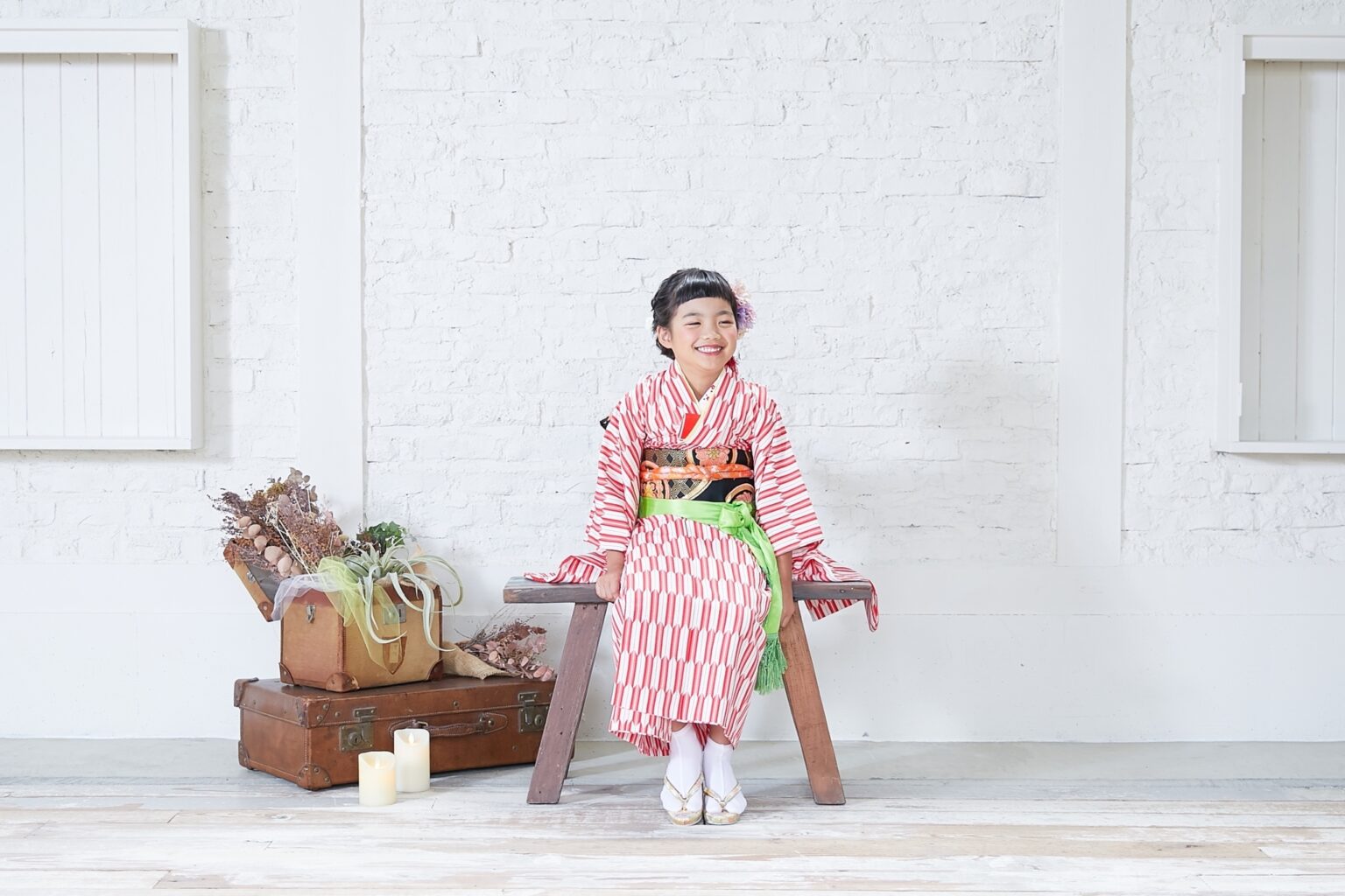 また、1階と2階を繋ぐ階段周辺はドライフラワーがたっぷり飾ってあったり、段差を活かした撮影もできて人気のフォトスポット。アンティークなミシン台やトランクを使った七五三撮影や、成人式の撮影にもオススメのフォトスポットです♪